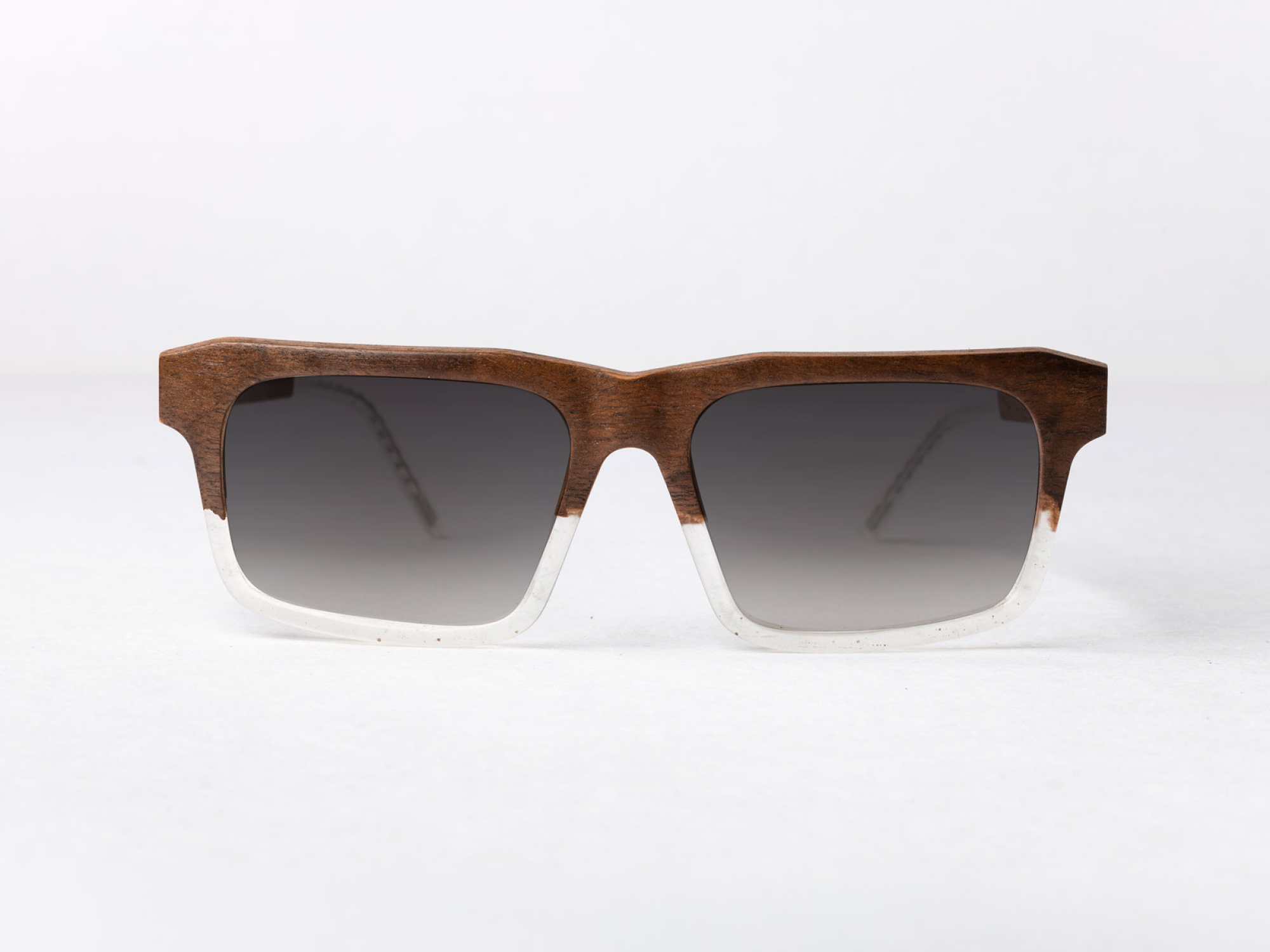 Застывший жидкий “лёд” и резкие линии превращают классическую прямоугольную форму в манифест силы духа. Оправа выполнена в технике Trapped In Ice, когда ювелирная смола сливается с натуральным деревом.